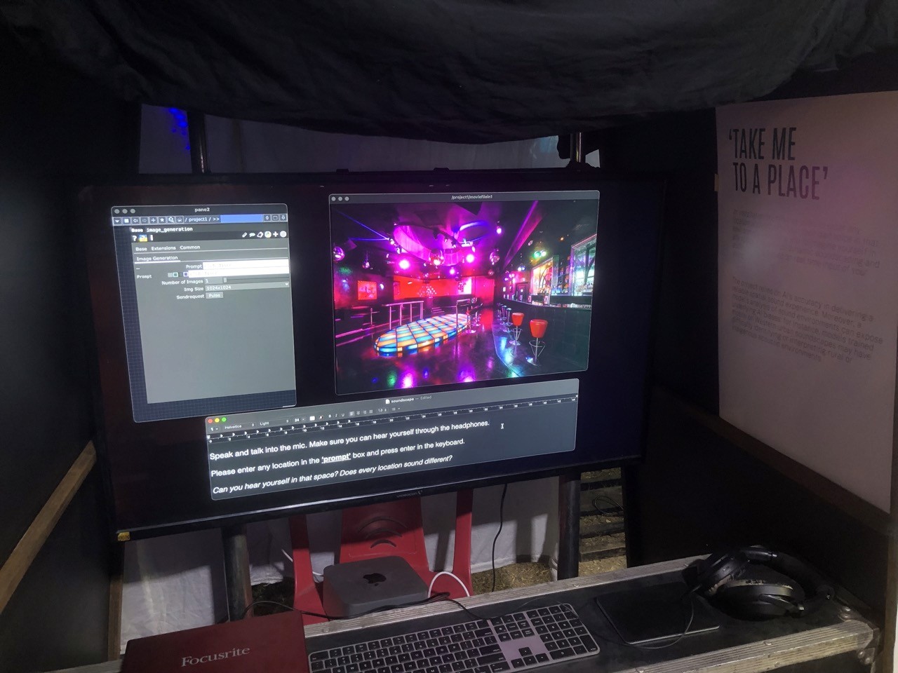 Take Me To A Place” is a sound immersion installation that asks users to describe any environment/location and instantly hear their voice as if speaking in that environment. Users can experience dynamic soundscaping and audio profiling based on active input provided by their voice and textual analysis of their prompt. This work also aims to expose underlying biases in the LLM’s analysis of sound environments: for instance, models trained mostly on Western urban soundscapes may have difficulty identifying or interpreting rural or indigenous acoustic environments.