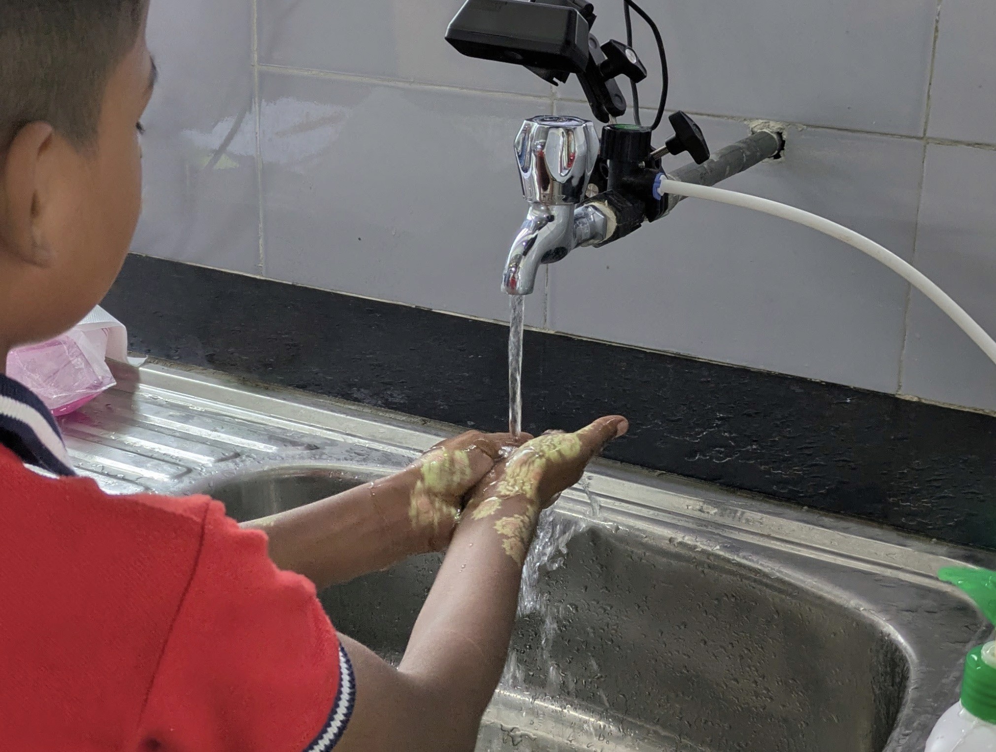 By combining real-time hand tracking with creative germ-busting animations, WashPlay shows live projections of germs on their hands being washed away as they use soap and water.